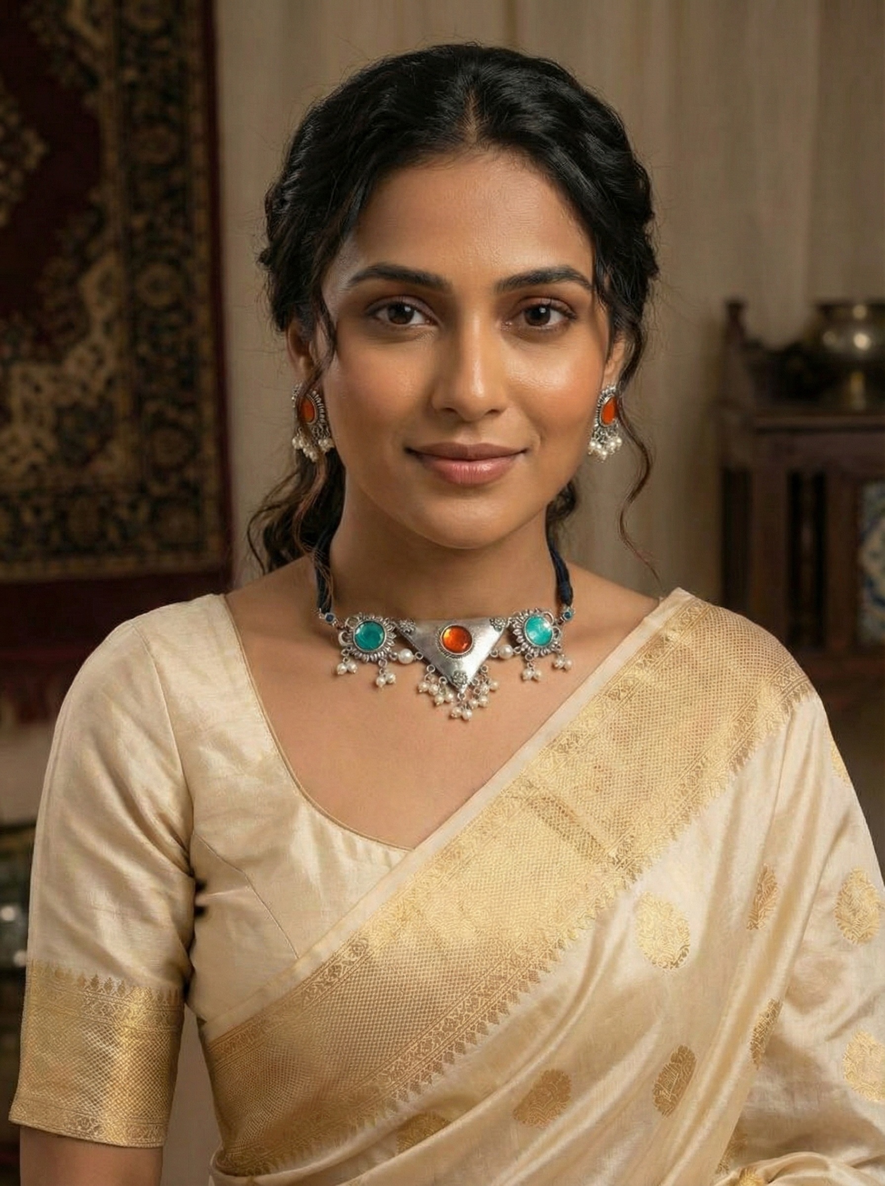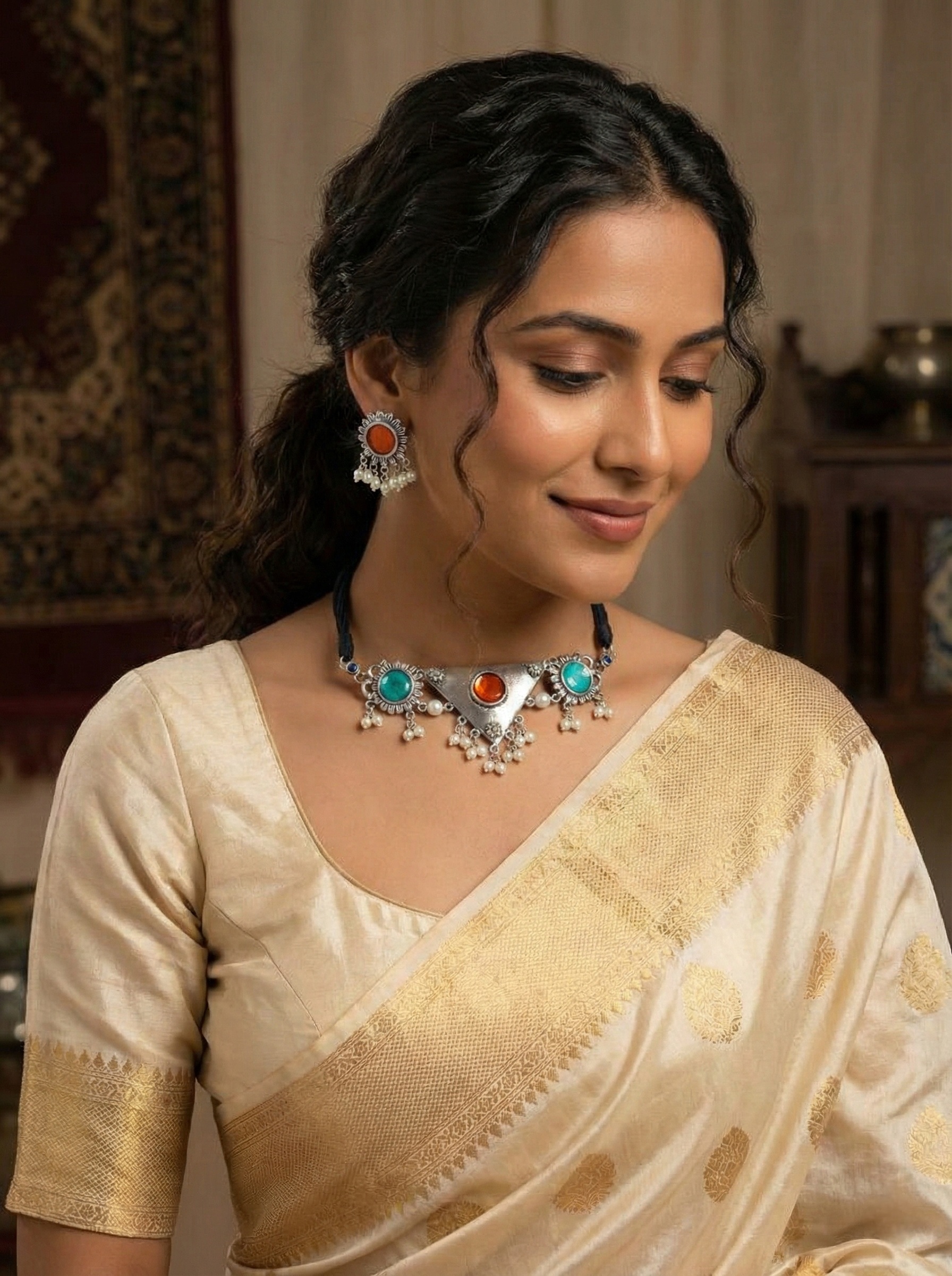 New Beautiful Silver Oxidised Mirror Ethnic Choker Set